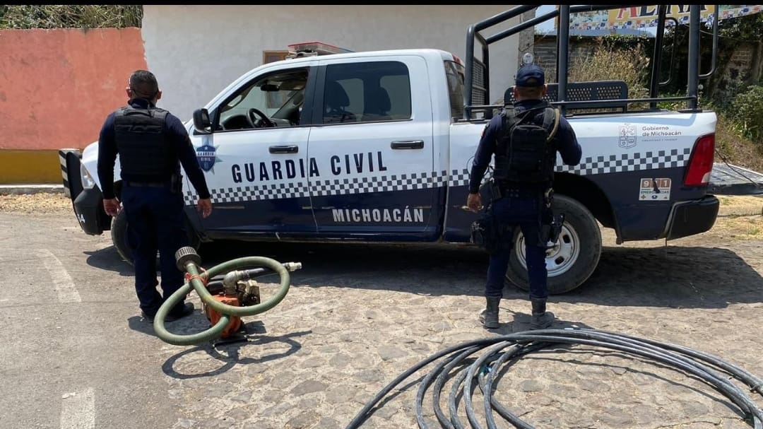 El primer hallazgo se llevó a cabo a través de un reporte hecho al 911, donde el denunciante informó sobre el huachicoleo de agua en las cercanías a la isla de Urandén, por lo que personal del agrupamiento realizó la búsqueda y localización de la bomba, misma que aún se encontraba prendida abasteciendo un predio de siembra que se encontraban metros más adelante.