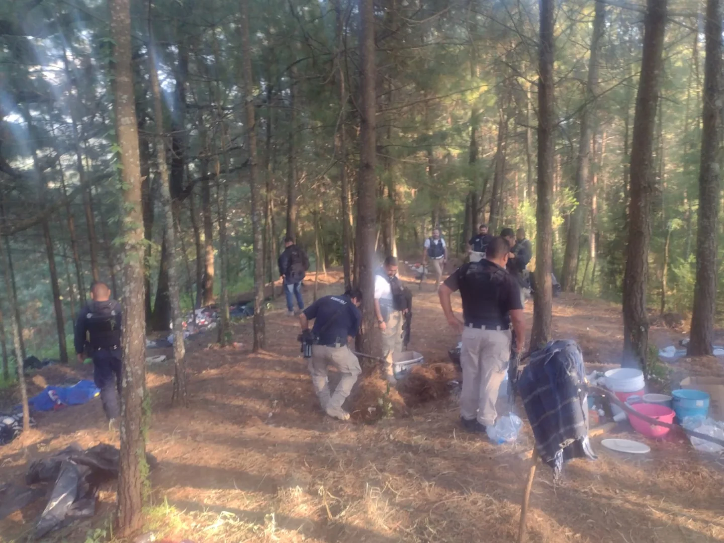 Al realizar recorridos de prevención y disuasión del delito, los agentes localizaron un campamento clandestino, donde fueron hallados diversos objetos personales, así como una manta escrita con un mensaje alusivo a conductas delictivas en la región.
