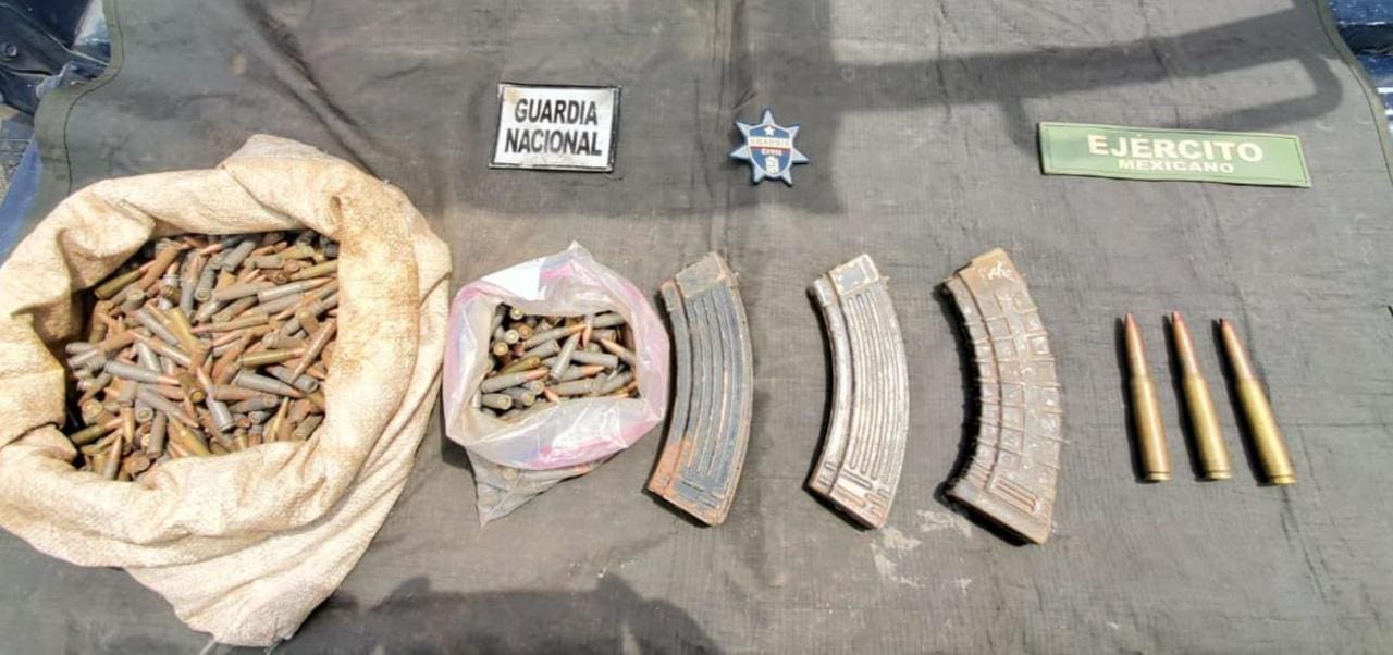Los elementos de seguridad patrullaron los caminos de terracería y encontraron los cartuchos de calibres 7.62X39, .50 y .223 milímetros, así como los cargadores 7.62X39, que fueron puestos a disposición de la autoridad competente para las investigaciones correspondientes.