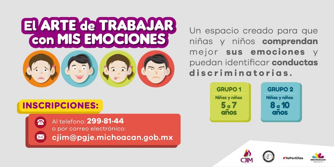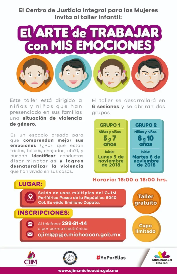Morelia, Michoacán..- Con el objetivo de que niñas y niños adquieran herramientas que les permitan desarrollar y reforzar el control de sus sentimientos tras haber sido víctimas o testigos de alguna situación de violencia, la Procuraduría General de Justicia del Estado (PGJE), a través del Centro de Justicia Integral para las Mujeres (CJIM), llevará a cabo el taller “El arte de trabajar con mis emociones”.