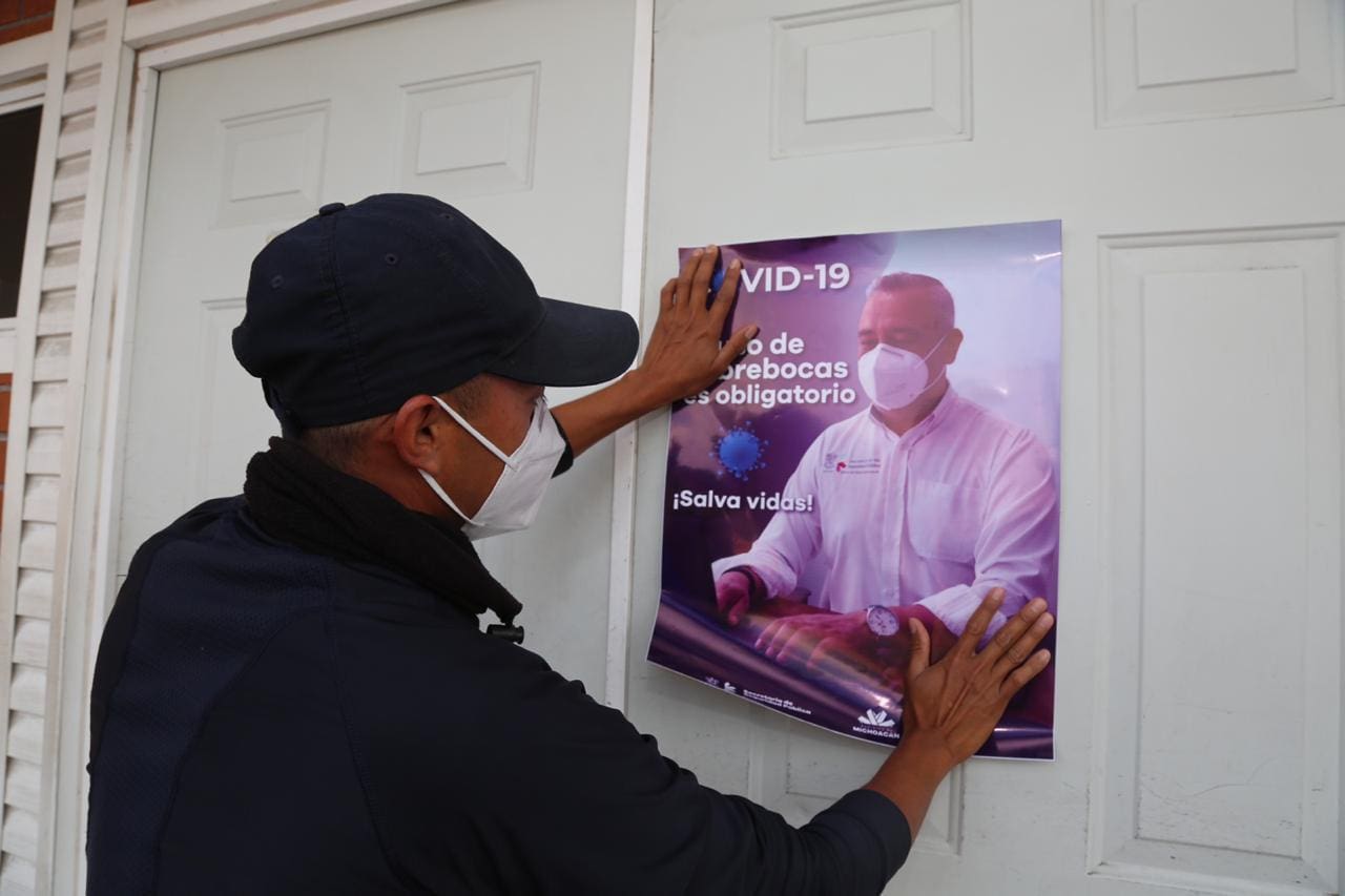 Elementos de la Policía Michoacán realizaron la colocación de carteles en distintas partes de los complejos regionales de Uruapan, Lázaro Cárdenas, Coalcomán, Jiquilpan, Apatzingán, Huetamo y Zitácuaro, con el objetivo de que el personal respete las medidas dispuestas por las autoridades de la salud.