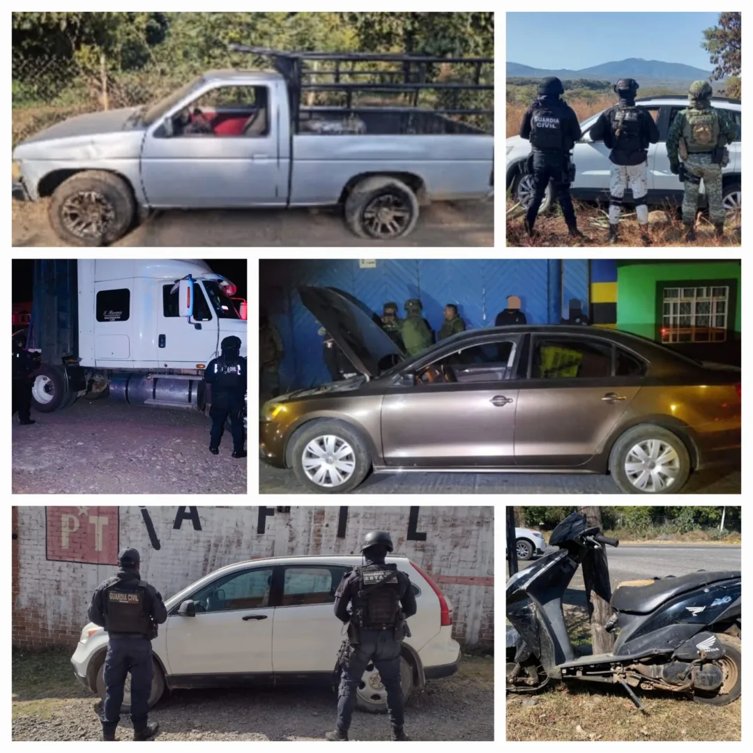 En Uruapan y Jiquilpan, los oficiales de SP localizaron tres vehículos -uno de la marca Nissan y dos Volkswagen-; dos de ellos presentaban huellas de desvalijamiento y reporte de robo vigente, mientras que el tercero fue asegurado junto a su conductor por contar con placas de circulación sobrepuestas. De igual manera, sobre los municipios de Zitácuaro y Tacámbaro, dos unidades motoras Nissan y Honda con reporte de robo fueron aseguradas.