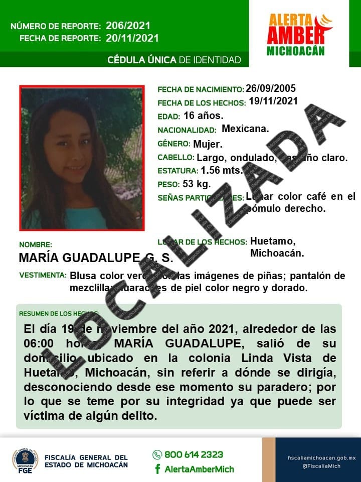 Huetamo, Michoacán, a 22 de noviembre de 2021.- La Fiscalía General del Estado de Michoacán (FGE) localizó a una adolescente de 16 años de edad, quien fue reportada como desaparecida en el municipio de Huetamo.