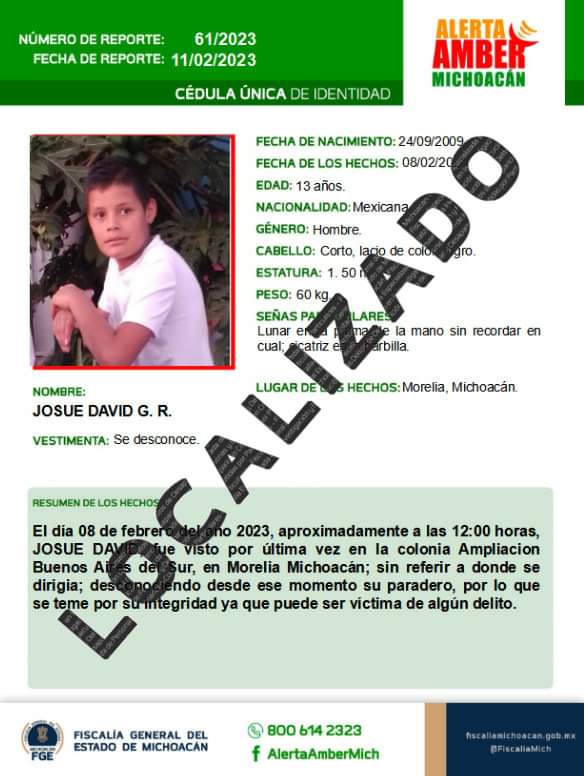 Personal de dicha Fiscalía Especializada llevó a cabo diversas actuaciones que permitieron localizar al adolescente, quien se encontraba -sano y salvo- en el municipio de Pátzcuaro, por lo que se dio por concluida la investigada.