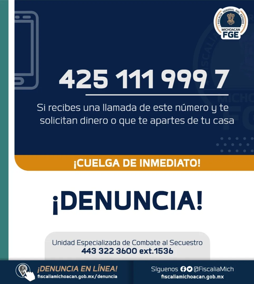 La FGE solicita a la población, no atender este tipo de llamadas y denunciarlas de forma inmediata ante la Fiscalía Regional más cercana, o bien a la Unidad Especializada de Combate al Secuestro, ubicada en Periférico Independencia #5000, colonia Sentimientos de la Nación en Morelia, o comunicarse al teléfono 443 322 36 00 extensión 2234.