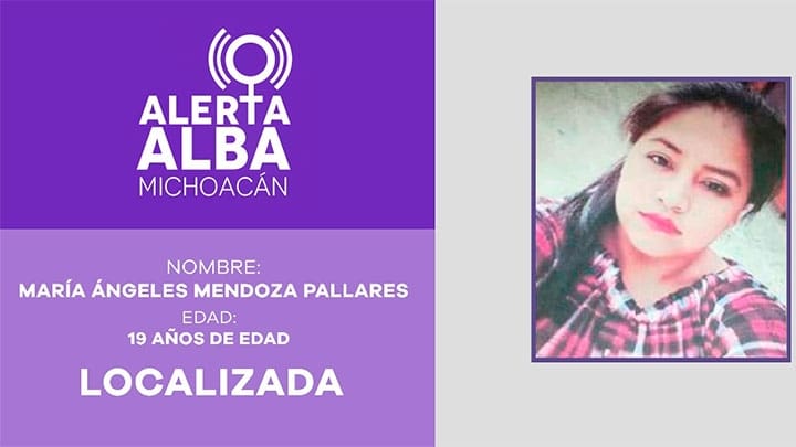 Luego de algunos días se logró ubicar a María Ángeles, quien refirió que salió de su casa por voluntad propia para estar con una persona con la que tenía amistad, por lo que la Carpeta de Investigación se cerró y la Alerta Alba fue desactivada.Con estas acciones la PGJE refrenda su compromiso de mantener acciones firmes encaminadas a garantizar seguridad y bienestar a las mujeres michoacanas.