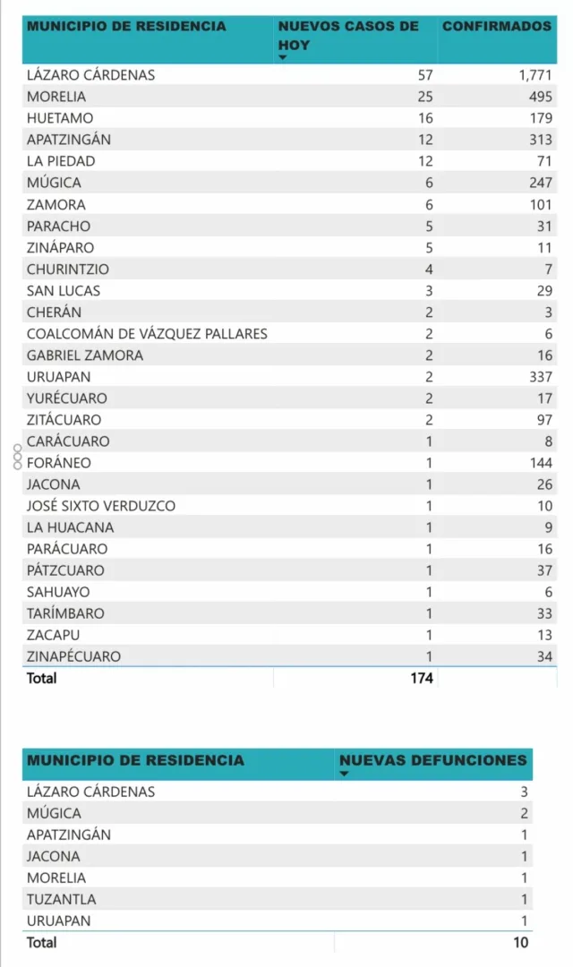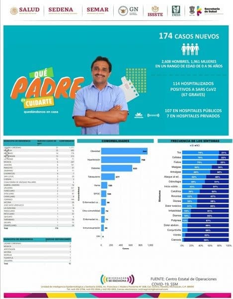 Zitácuaro Michoacán. El Comité Estatal de Seguridad en Salud reportó que al día de hoy 365 personas han muerto en Michoacán por COVID-19 y reporta 4569 casos acumulados con reporte positivo de Coronavirus en diferentes municipios, esto es 174 casos nuevos en menos de 24 horas, entre los municipios más afectados se encuentran: LÁZARO CÁRDENAS, MORELIA, APATZINGÁN, URUAPAN, MÚGICA Y HUETAMO .