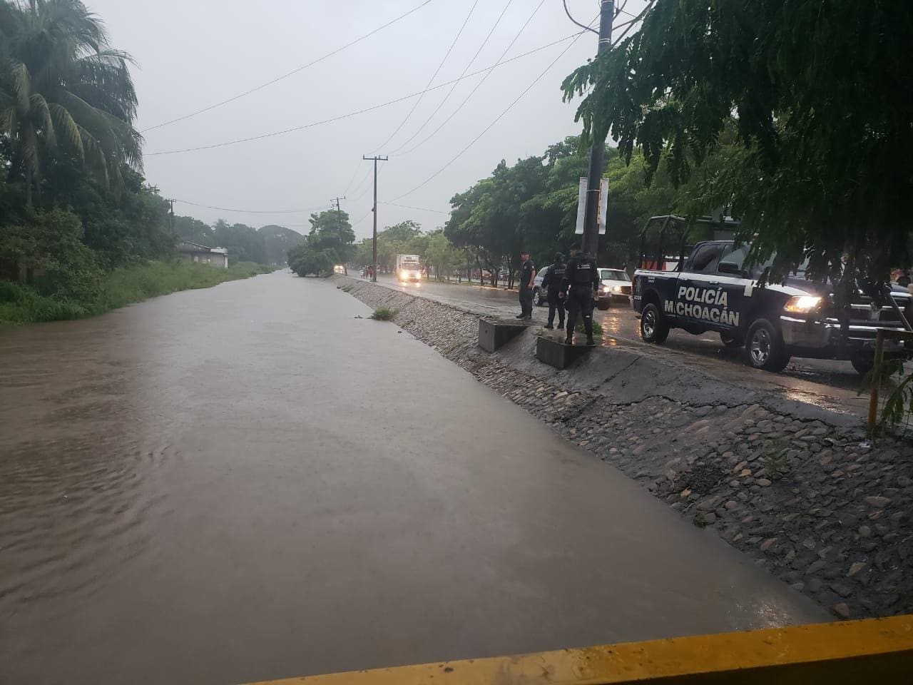 Personal de la Policía Michoacán, lleva a cabo patrullajes de vigilancia constante en 10 colonias donde se presentan algunas inundaciones y encharcamientos; de igual forma, se verifica el nivel de algunos de un río ubicado en la localidad el Habillal.