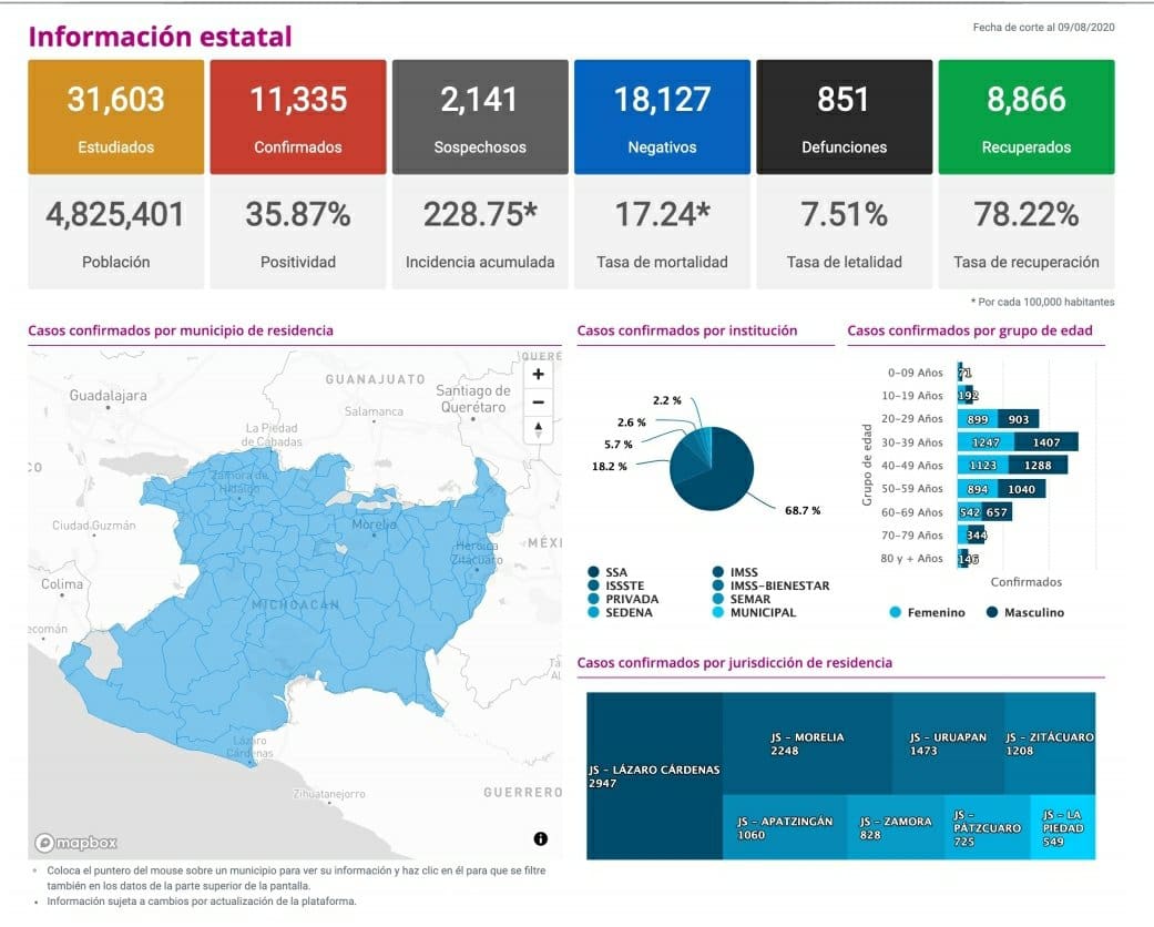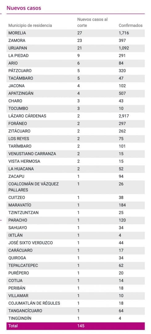 Zitácuaro Michoacán. El Comité Estatal de Seguridad en Salud reportó que al día de hoy 851 personas han muerto en Michoacán por COVID-19 y reporta 11,335 casos acumulados con reporte positivo de Coronavirus en diferentes municipios, esto es 145 casos nuevos en las últimas 24 horas, entre los municipios más afectados se encuentran:Lázaro Cárdenas, Morelia, Uruapan, Huetamo, Zamora, Múgica y Pátzcuaro.