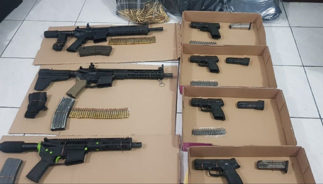 Al momento de solicitarles la documentación que los acreditara como elementos activos, no lo hicieron, por lo que aseguraron ocho armas de fuego de distintos calibres; además, en el vehículo, les encontraron una fornitura de lona color negra, 748 cartuchos, dos juegos de candados de mano con sus respectivas llaves, una piernera color verde y dos paquetes en forma cuadrada confeccionados con cinta canela, que contenían en su interior hierba verde y seca, con las características de la marihuana.