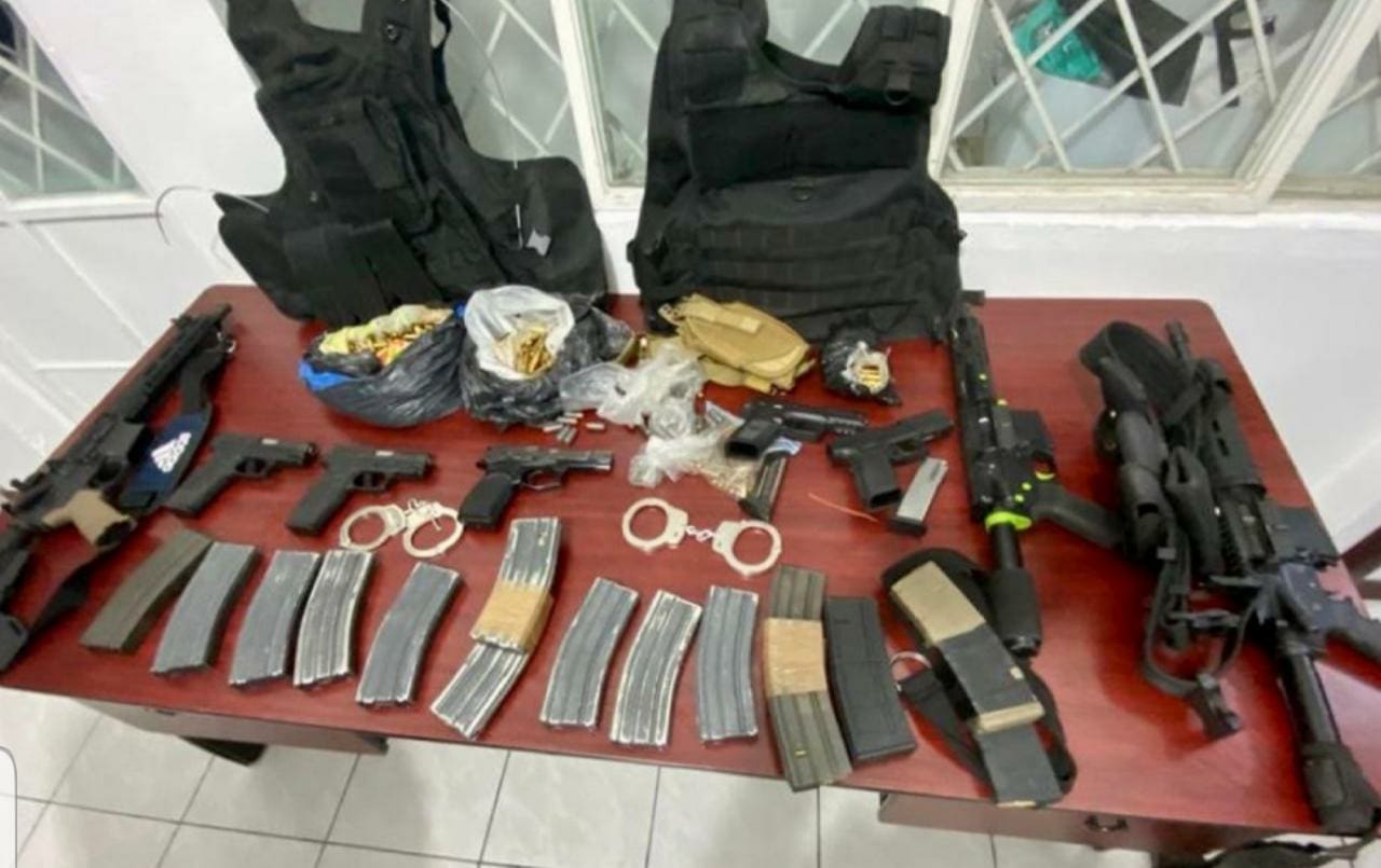 Al momento de solicitarles la documentación que los acreditara como elementos activos, no lo hicieron, por lo que aseguraron ocho armas de fuego de distintos calibres; además, en el vehículo, les encontraron una fornitura de lona color negra, 748 cartuchos, dos juegos de candados de mano con sus respectivas llaves, una piernera color verde y dos paquetes en forma cuadrada confeccionados con cinta canela, que contenían en su interior hierba verde y seca, con las características de la marihuana.