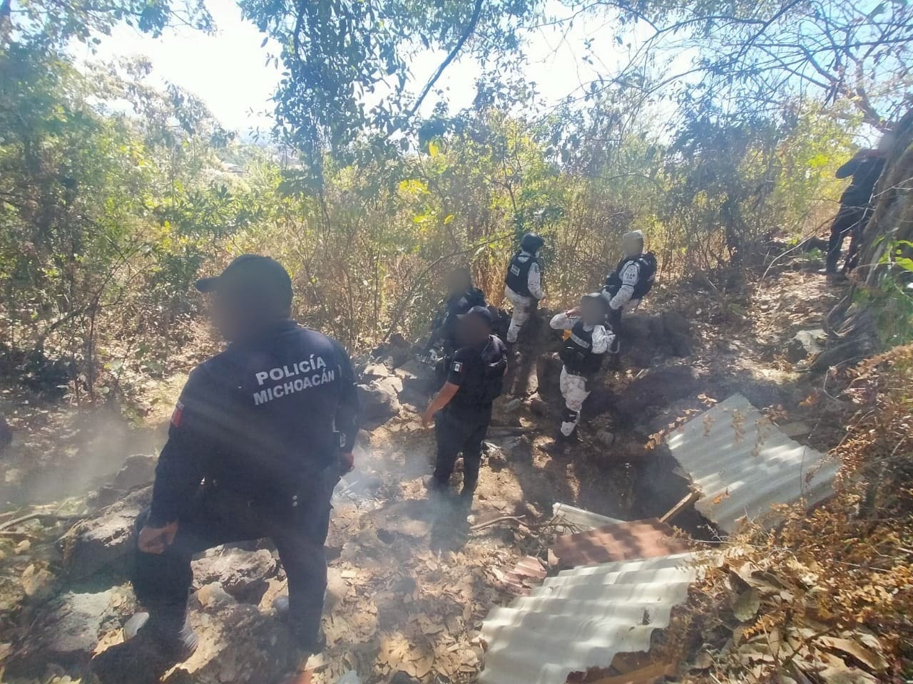 El hecho se efectuó cuando agentes de la Policía Michoacán, de la GN y Policía Municipal efectuaban labores operativas, y sobre una brecha que conduce a Lomas de Uruapan, ubicaron el campamento improvisado, por lo que procedieron a inspeccionar el sitio.