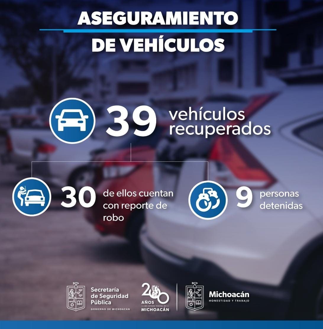 Los automotores fueron localizados principalmente en estado de abandono durante patrullajes itinerantes llevados a cabo en los municipios de Cuitzeo, Uruapan, Jacona, Chucándiro, Villamar, Zamora, Apatzingán, Buenavista, Puruándiro, Lázaro Cárdenas, Tangamandapio, Chilchota, Huetamo, Numarán y Morelia.