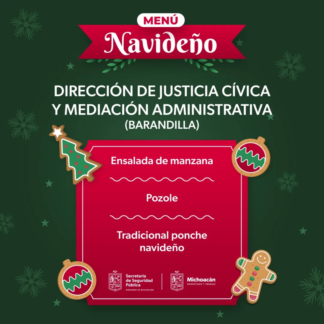 Morelia, Michoacán a 21 de diciembre 2022.- Pozole, ponche y ensalada de manzana, serán los alimentos que se darán en la cena navideña que la Secretaría de Seguridad Pública (SSP), a través de la Dirección de Justicia Cívica y Mediación Administrativa (Barandilla), brindará a las personas retenidas de manera preventiva.