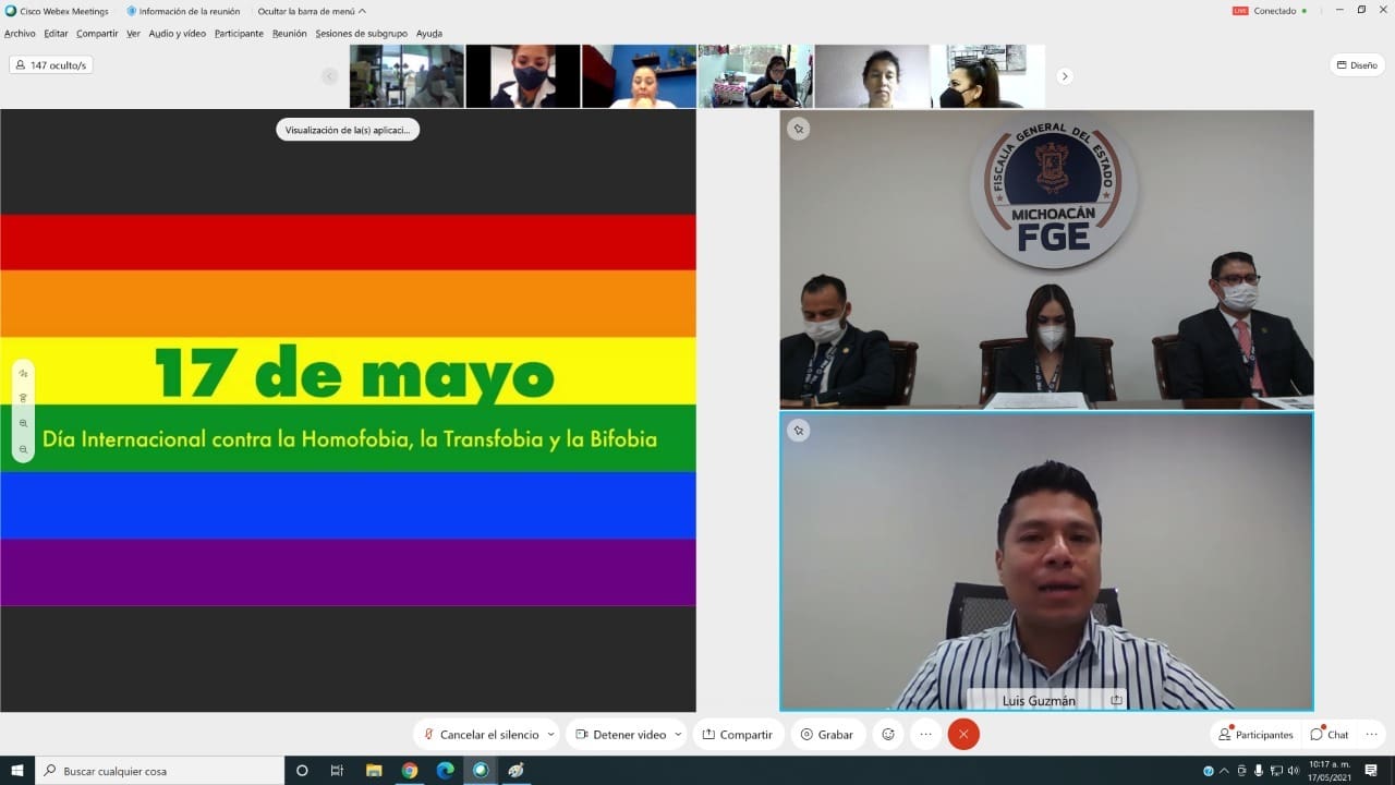 Morelia, Michoacán, a 17 de mayo de 2021.- Con el objetivo de concientizar y sensibilizar al personal de la Fiscalía General del Estado de Michoacán (FGE), para garantizar el respeto de los derechos de las personas LGBTI+, se llevó a cabo la conferencia “Igualdad y No Discriminación a Personas LGBTI+”, en el marco del Día Internacional Contra la Homofobia, la Transfobia y Bifobia.