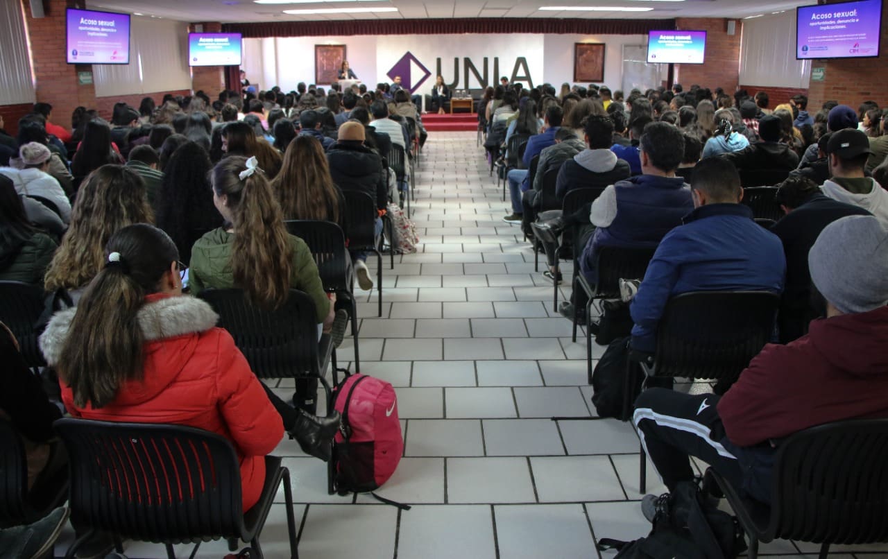 Frente a una audiencia de más de 200 personas, la directora de Servicios Integrales, Yunuén Méndez Silva; y el director de Acceso a la Justicia, José García Mendiola, desarrollaron de manera amena y dinámica la charla titulada “Acoso sexual: oportunidades, denuncia e implicaciones”, la cual fue escuchada por alumnado de bachillerato y de 13 licenciaturas.