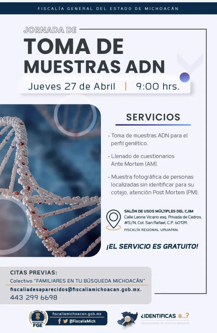 Morelia, Michoacán, a 26 de abril de 2023.- Como parte de los trabajos para coadyuvar en las acciones de búsqueda y localización de personas desaparecidas, la Fiscalía General del Estado de Michoacán (FGE) llevará a cabo una jornada de toma de muestras de ADN, el día 27 de abril, en Uruapan.