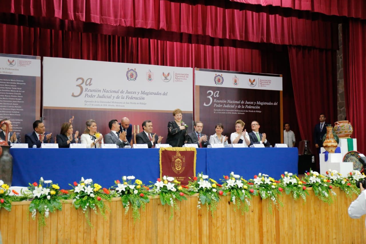 Morelia, Michoacán, a 26 de octubre de 2018.- El papel que desempeñan los ministros, magistrados y jueces es trascendental para la vida democrática de México, donde se respeten las divergencias y se anteponga la correcta aplicación de la justicia con pleno respeto a los derechos humanos, externó Juan Bernardo Corona Martínez al inaugurar la Tercera Reunión Nacional de Jueces y Magistrados del Poder Judicial de la Federación, Egresados de la Universidad Michoacana de San Nicolás de Hidalgo (UMSNH).