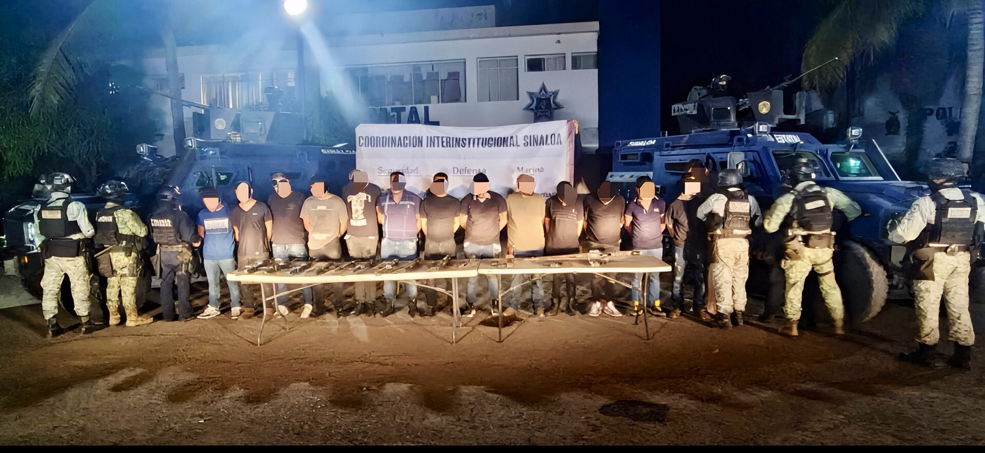 En una segunda acción llevada a cabo en el municipio de Navolato, elementos de la Secretaría de la Defensa Nacional, Guardia Nacional, la Secretaría de Seguridad Pública de Sinaloa y la Fiscalía General de la República (FGR) detuvieron a 14 personas. Durante el operativo se aseguraron 13 armas largas y una ametralladora.