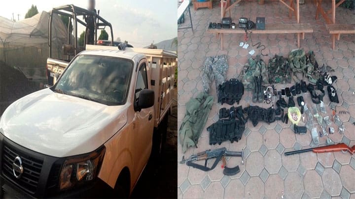 También se aseguraron un vehículo blanco, marca Nissan pick up; dos armas largas, cartuchos útiles, hierba seca con las características propias de la marihuana, y equipo de radio y táctico, los cuales serán puestos a disposición de la autoridad correspondiente.