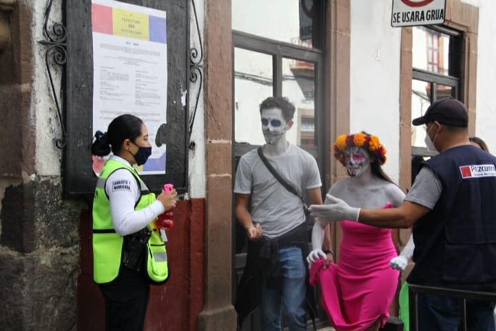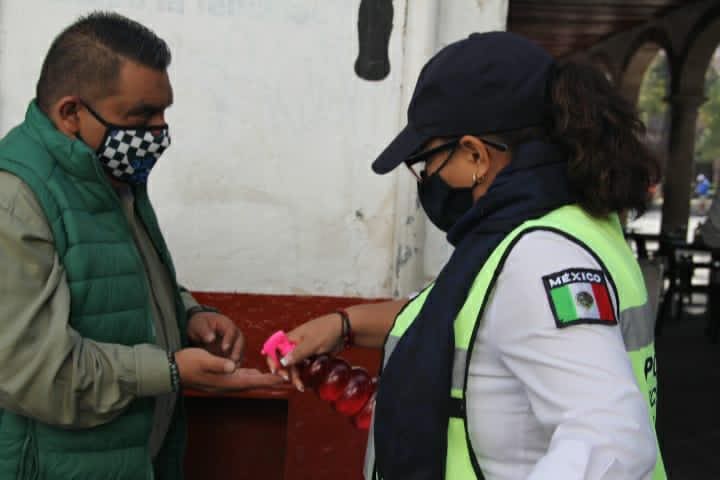 En los citados lugares, los agentes llevan a cabo trabajos de vigilancia y realizan la dispersión de gel antibacterial, entrega de cubrebocas e invitan a los visitantes a respetar las medidas sanitarias, como lo es evitar aglomeraciones, saludar de mano o beso, así como estornudar de etiqueta.