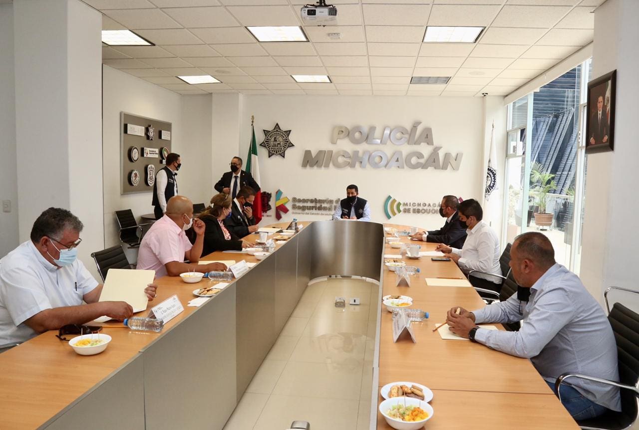 Morelia, Michoacán.- Como parte del fortalecimiento de la estrategia que se implementa en el Estado, el secretario de Seguridad Pública, Israel Patrón Reyes, se reunió con el presidente de la Comisión de Seguridad Pública y Protección Civil del Congreso del Estado Humberto González Villagómez y el diputado Arturo Hernández Vázquez, así como, con los presidentes municipales de Huaniqueo, Huandacareo, Jimenéz, Penjamillo, Morelos y José Sixto Verduzco, para revisar los mecanismos de operación que permitan reforzar las labores de disuasión del delito.