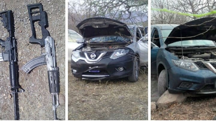 En el interior de las unidades, una Nissan Xtrail color gris plata y otra Xtrail azul marino, ambas con reporte de robo, se localizó un arma de fuego AK-47 calibre 7.62×39 y un fusil, calibre 5.56.