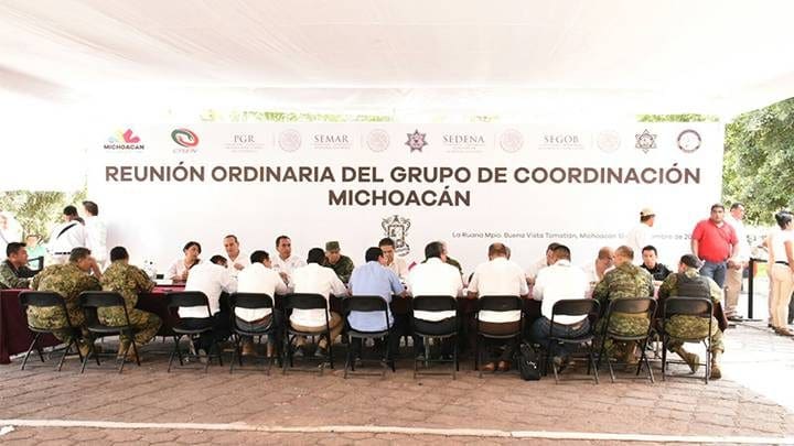 Felipe Carrillo Puerto, mpio. de Buenavista, Michoacán.- Para revisar las acciones que en materia de seguridad se emprenden en la región, el Grupo de Coordinación Michoacán encabezado por el Gobernador Silvano Aureoles Conejo y el general Pedro Felipe Gurrola Ramírez, sesionó en esta comunidad de la Tierra Caliente, popularmente conocida como La Ruana.