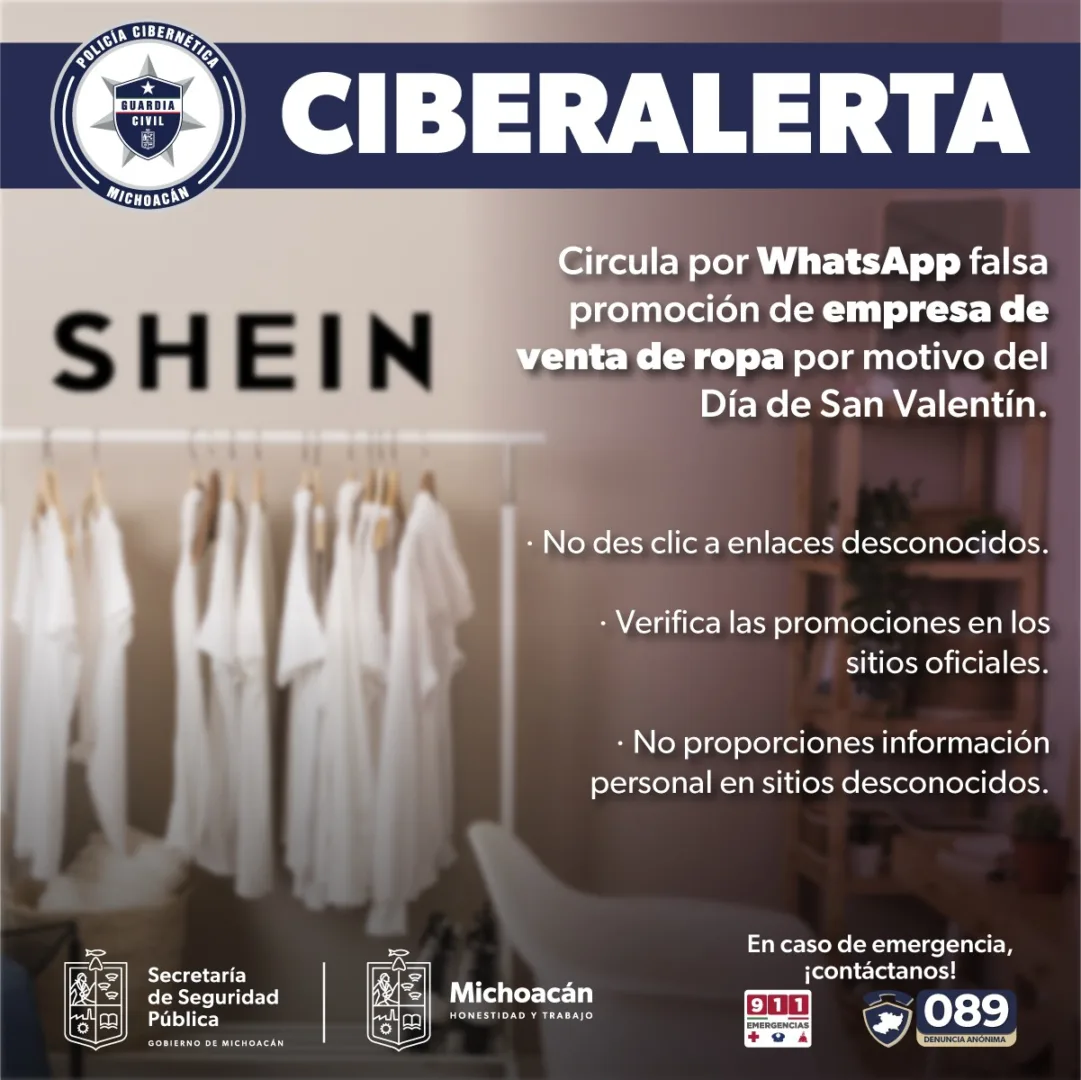 Michoacán, 19 de enero del 2023.- Mediante denuncias ciudadanas realizadas a los teléfonos de emergencias, el personal de la Policía Cibernética, de la Secretaría de Seguridad Pública (SSP), detectó un fraude vía WhatsApp, donde la empresa de venta de indumentaria SHEIN, te solicita información personal a cambio de brindarte ofertas y descuentos de ropa; la compañía ya desmintió este hecho.