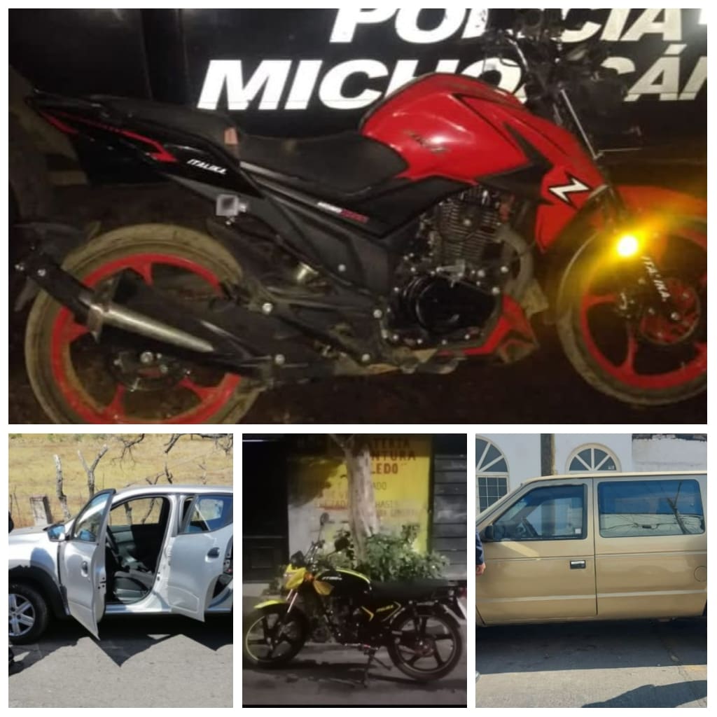 A través de recorridos de prevención del delito y patrullajes, los agentes de la Policía Michoacán aseguraron una camioneta tipo Caravan marca Dodge, un automóvil Renault y dos motocicletas Italika, todos con reporte de robo.