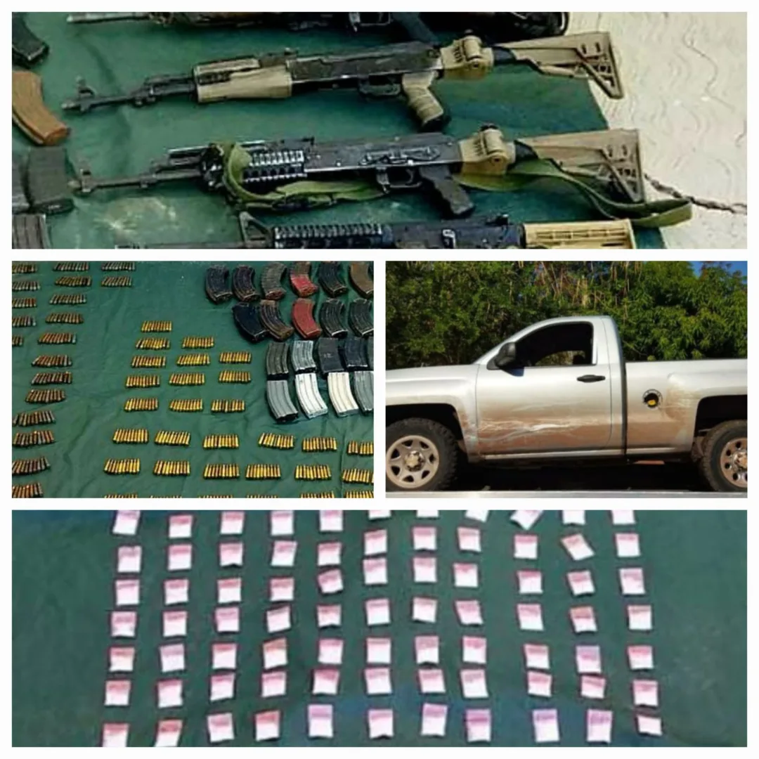 Apatzingán, Michoacán, a 28 de junio del 2023.- En una reciente acción conjunta entre las Secretarías de la Defensa Nacional (Sedena) y la Guardia Nacional (GN), en el municipio de Apatzingán se logró asegurar tres vehículos, de los cuales uno cuenta con reporte de robo, cuatro armas largas de fuego, cargadores, cartuchos útiles, equipo táctico y droga.