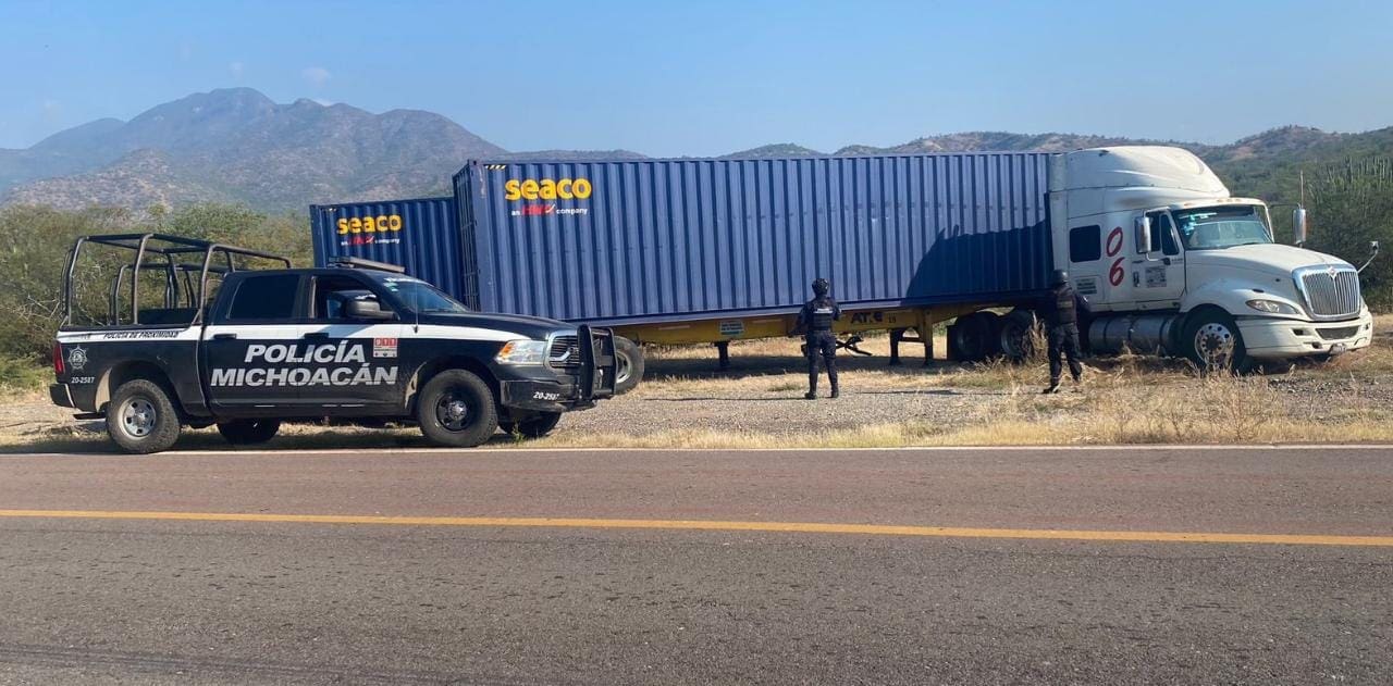 Lázaro Cárdenas, Michoacán, a 24 de noviembre del 2021.- En labores operativas, los elementos de la Secretaría de Seguridad Pública (SSP), recuperaron un tractocamión y dos contenedores, mismos que al ser verificados, se corroboró que cuentan con reporte de robo.