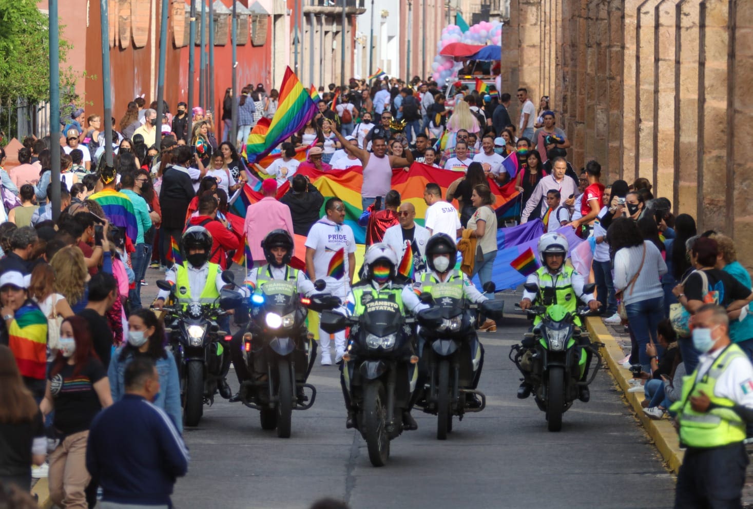 Morelia, Michoacán, 18 de junio del 2022.- En una acción de respeto a la libertad de expresión y en aras de mantener el orden público, los elementos de la Secretaría de Seguridad Pública (SSP), brindan acompañamiento y asistencia vial a los participantes de la marcha del Pride Michoacán, que se desarrolla en el Centro Histórico de Morelia.