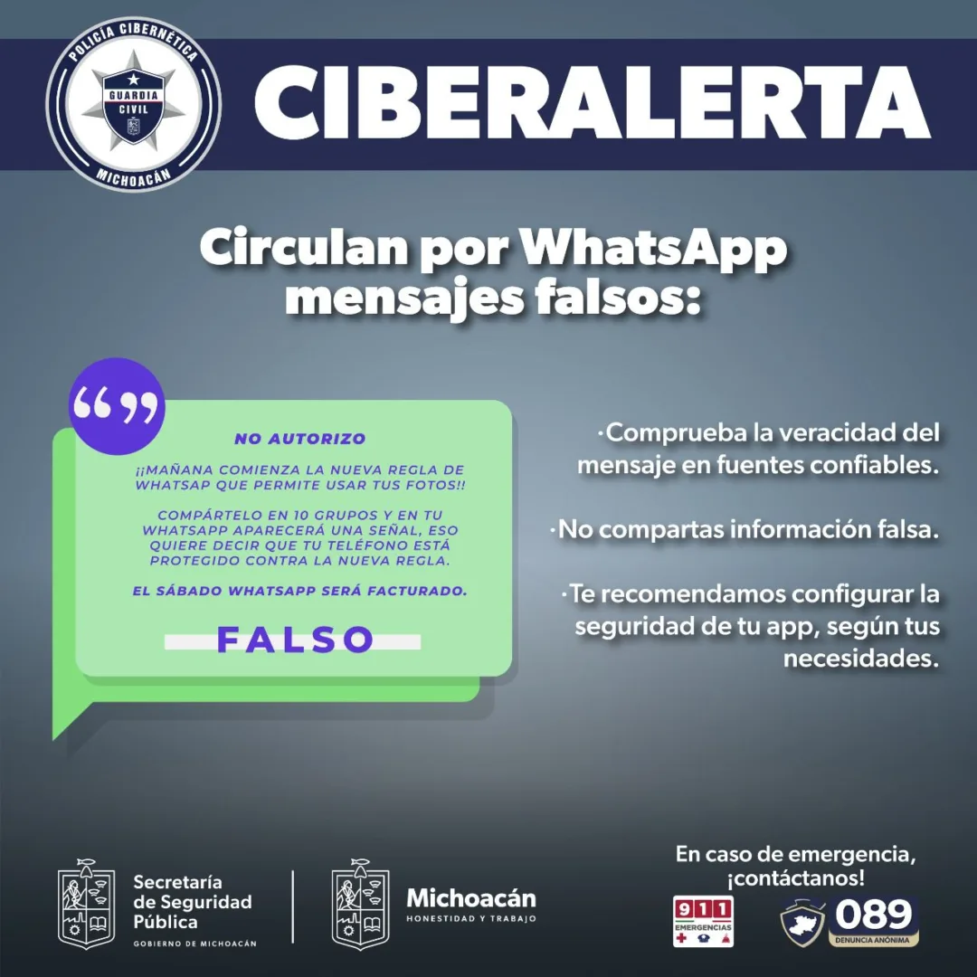 Morelia, Michoacán, 8 de noviembre del 2022.- La Secretaría de Seguridad Pública (SSP), a través de la Policía Cibernética, emite una alerta a la ciudadanía para evitar difundir cadenas de mensajes enviados en la red social de WhatsApp, en donde mencionan que los datos personales, así como las conversaciones, serán utilizadas para fines ajenos al uso del sistema de mensajería y que a la vez mencionan que la aplicación comenzará a cobrar por utilizar la misma, por lo que para evitar lo dicho anteriormente, deberán reenviar ese mensaje. Estas cadenas son falsas y no tienen que ver con las configuraciones y actualizaciones de la aplicación.