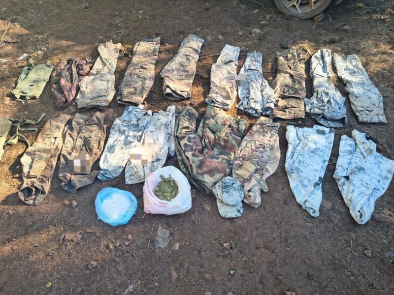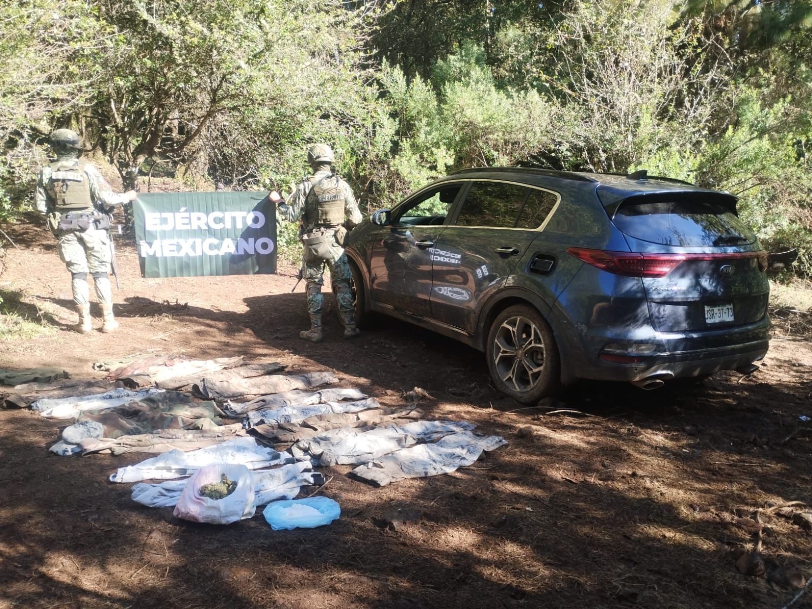 • 12 casas de campaña y diversas prendas de equipo táctico con insignias relacionadas a grupos delictivos.