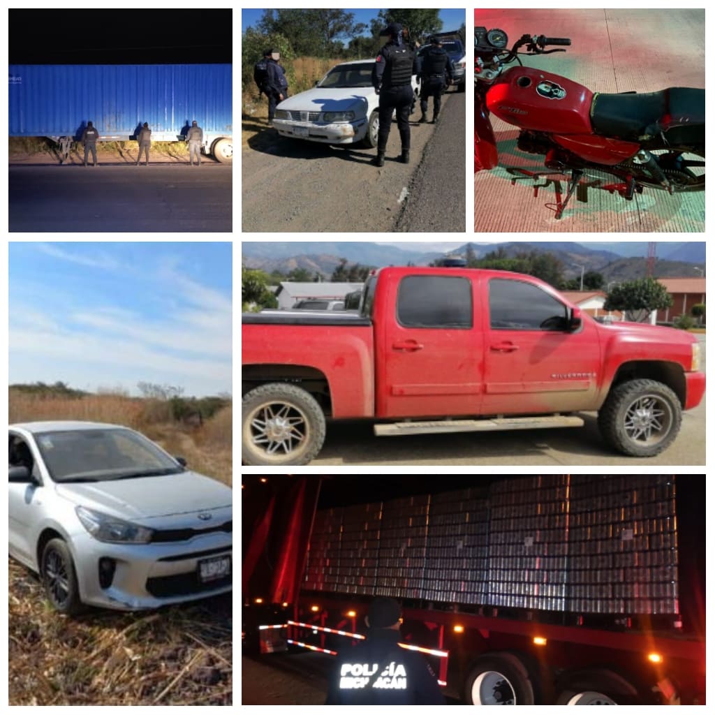 Los dispositivos de inspección y patrullajes en las localidades de estas demarcaciones, así como las zonas de mayor movilidad, permitieron a los integrantes de la Policía Michoacán, recuperar las siguientes unidades: un tractocamión marca Atro que contenía mercancía de una empresa cervecera, un vehículo Kia, un Nissan, un Chevrolet, una motocicleta Italika y un semirremolque marca Chief Trailers.