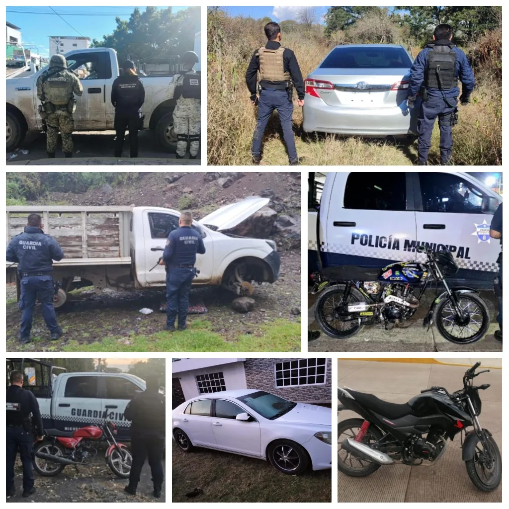 En los municipios de Aguililla, Apatzingán, Hidalgo, Maravatío, Morelia y Uruapan, los agentes de la Guardia Civil aseguraron automotores de las marcas Chevrolet, Ford, Honda, Italika, Nissan, Toyota y Vento, de los cuales 4 cuentan con reporte de robo, dos más con alteraciones y uno estaba en estado de abandono.