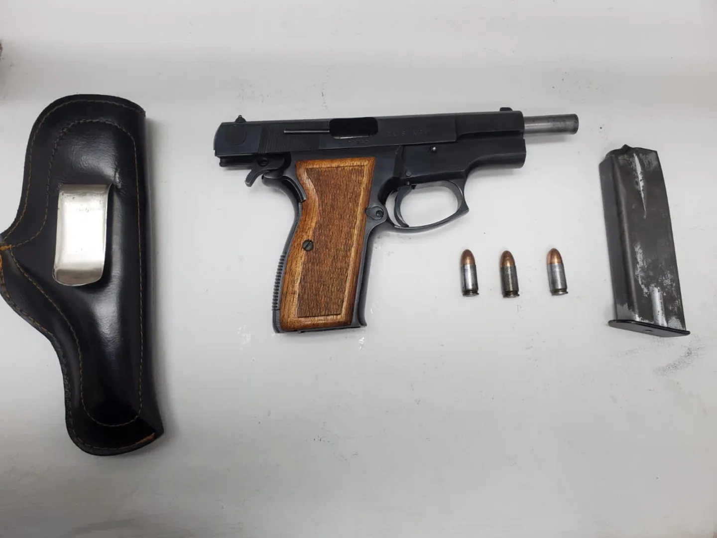 Tras realizar una inspección, a los dos hombres y a la mujer les fue hallada en el carro un arma de fuego calibre .9 milímetros, y tras revisar los antecedentes de la unidad, se confirmó que ésta cuenta con reporte de robo.