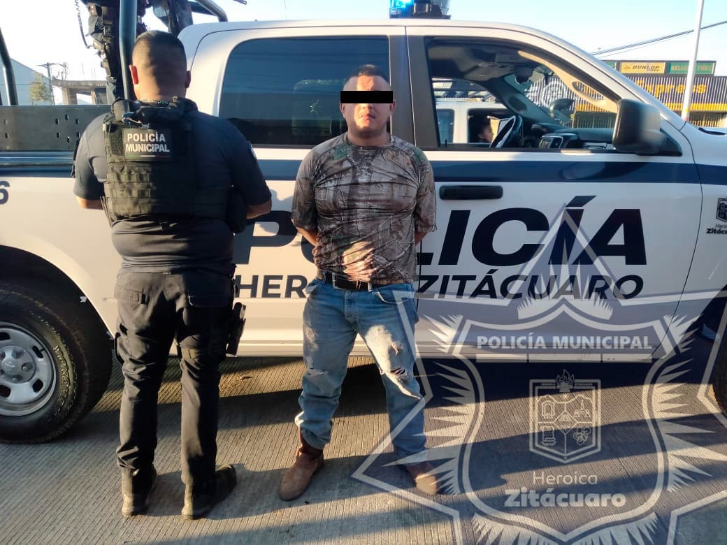 H. Zitácuaro, Mich., a 14 de marzo de 2022.- Durante recorridos de prevención en la tenencia Ignacio López Rayón, elementos de la Secretaría de Seguridad Pública Municipal logran la detención de un sujeto que se encontraba accionando un arma de fuego.