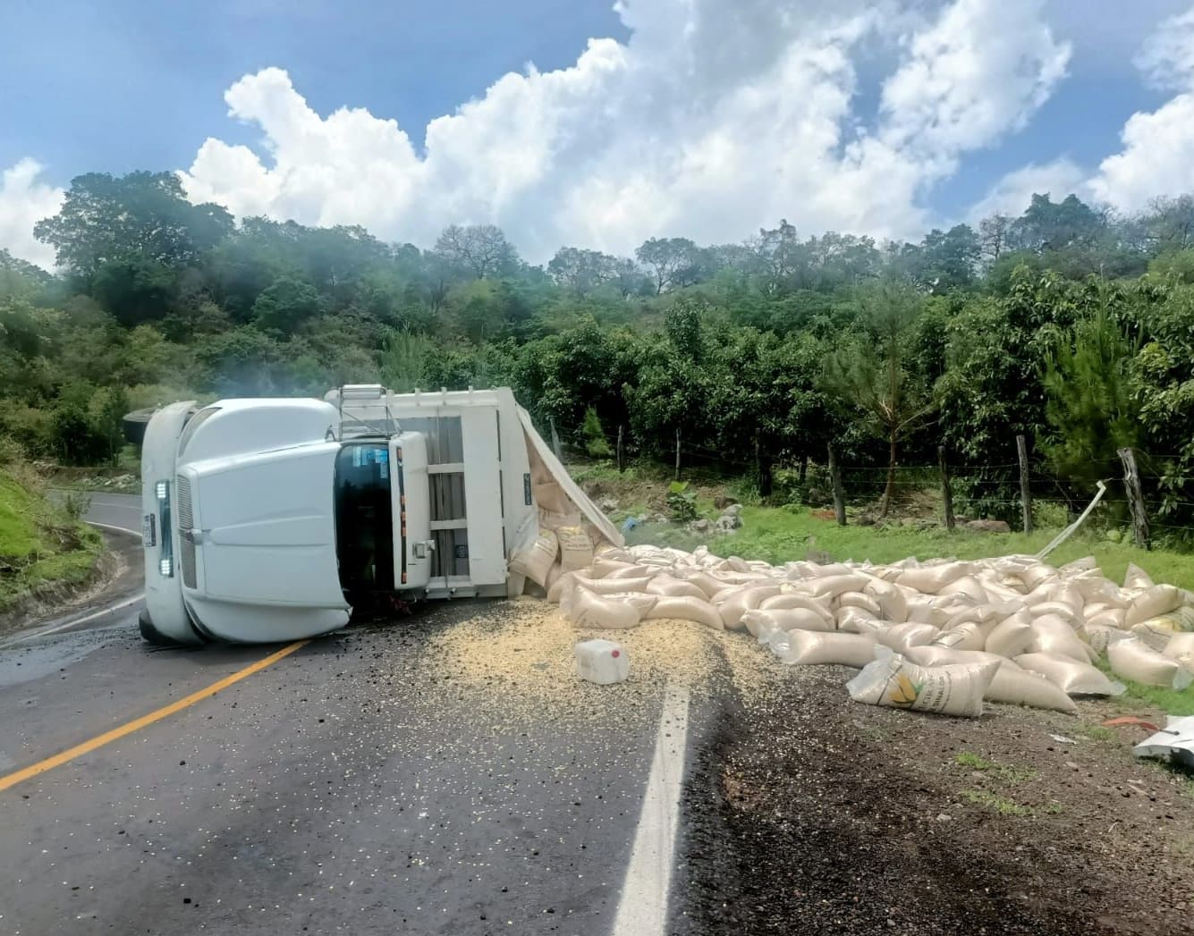 En el tramo carretero que conduce de Peribán a Buenavista, un tractocamión que transportaba maíz volcó en una curva, por lo que los agentes de vialidad acudieron a abanderar la zona, el cual después de consultar su documentación se confirmó que contaba con reporte de robo.