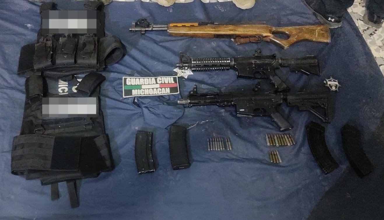 La acción reactiva permitió la detención de dos hombres, en posesión de dos rifles calibre .223 y 5.56 milímetros, ambos con número de serie esmerilado; así como de otro tipo AK-47, 67 municiones y cuatro cargadores.
