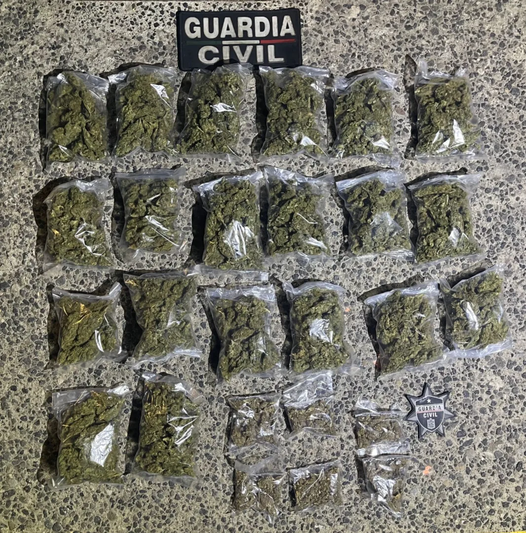 Al darles alcance y efectuar una revisión oficial, localizaron entre las pertenencias de los ahora detenidos, 26 envoltorios con la droga conocida como marihuana, por lo que fue asegurada y junto a los indiciados y el vehículo, puestos a disposición de la autoridad competente, quien llevará a cabo las diligencias que marca la Ley.