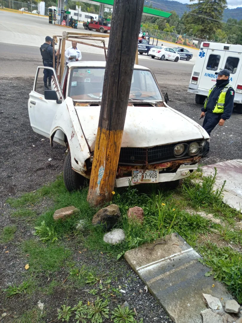Al llegar al lugar se visualizan los siguientes vehículos: camioneta Datsun tipo Pick Up, color blanco, conducido por un masculino de 57 años de edad con domicilio en Ocurio, a la valoración de los elementos presenta golpes contusos, por lo que es trasladado al hospital regional; se atiende a su acompañante, un masculino de 27 años, a la valoración no presenta lesiones aparentes.