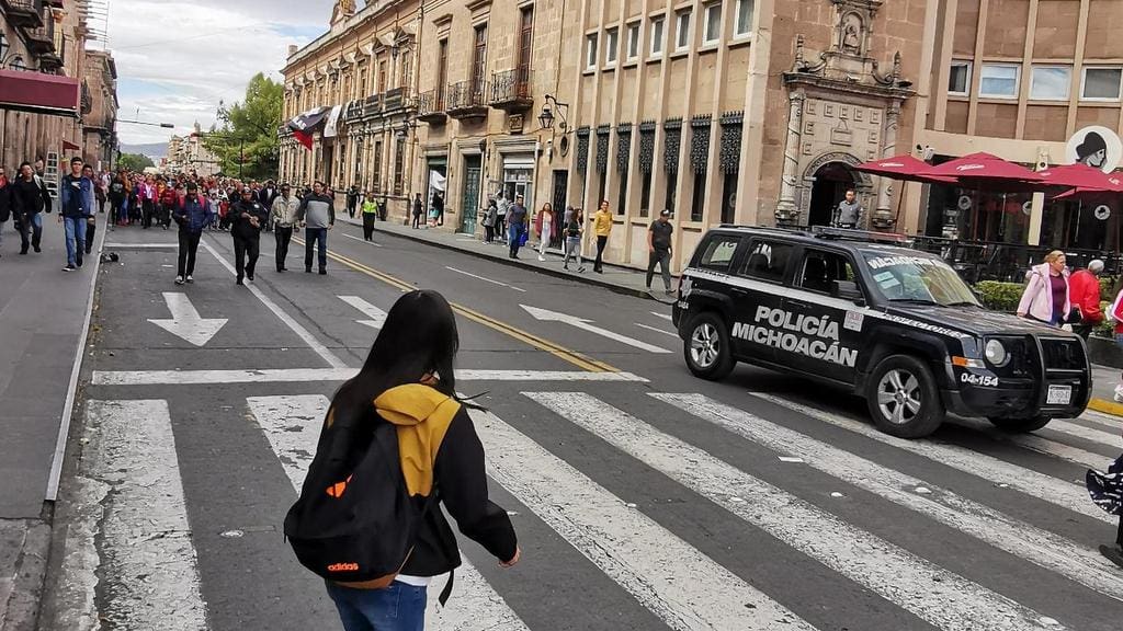 Morelia Michoacán.- Con la finalidad de preservar el orden, elementos de la Secretaría de Seguridad Pública (SSP), se encuentran realizando labores de vigilancia en las inmediaciones en la zona Centro de Morelia, ante una manifestación que se realiza.