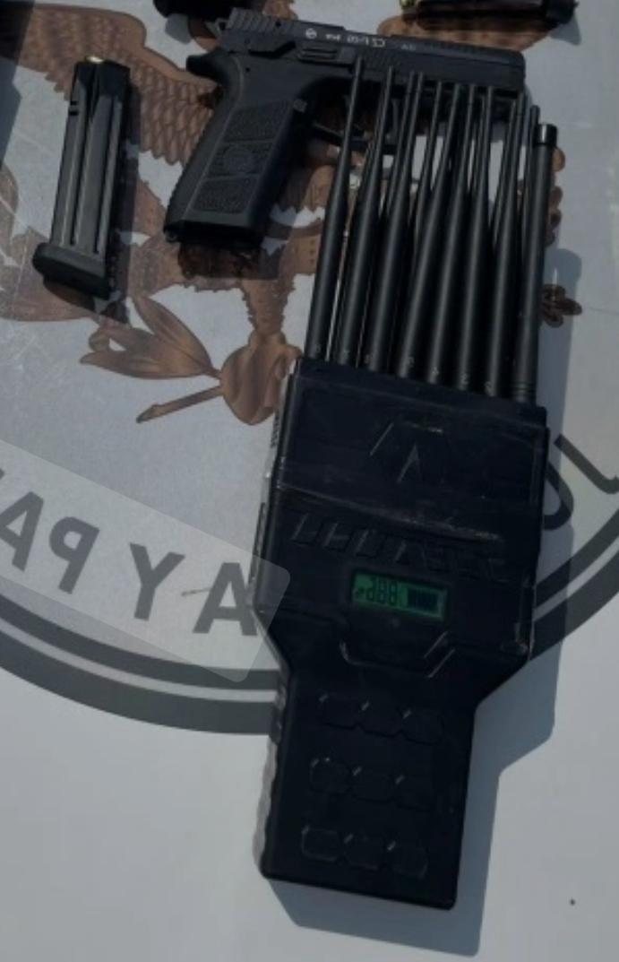 Agentes de la Policía de Investigación de la Fiscalía Estatal y la Guardia Civil localizaron al individuo en posesión de una pistola tipo escuadra con un cargador y municiones. Además, se le incautó un inhibidor de señal con ocho antenas y un recipiente de plástico que contenía marihuana.