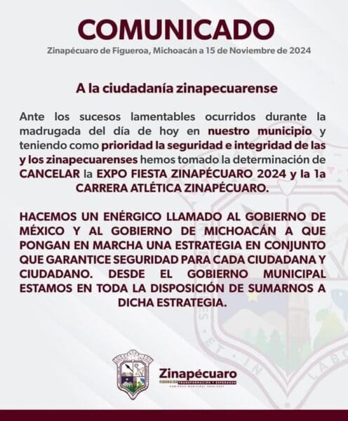 Como medida preventiva, el gobierno municipal de Zinapécuaro ha decidido cancelar la Expo Fiesta Zinapécuaro 2024 y la Primera Carrera Atlética Zinapécuaro, eventos que estaban programados para los próximos días, con el fin de salvaguardar la seguridad de los ciudadanos.