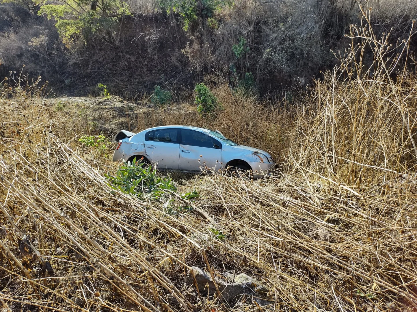 Zitácuaro. Mich. El Cuerpo de Bomberos, recibió un reporte vía telefónica, sobre que en la carretera Zitácuaro-Tuzantla, a la altura de Los Zapotes, se había suscitado una volcadura, por lo que se desplaza la unidad, se visualiza la novedad adelante del lugar mencionado, pasando la segunda curva rumbo al municipio de Benito Juárez, un vehículo volcado en una barranca de aproximadamente de 5 metros altura.