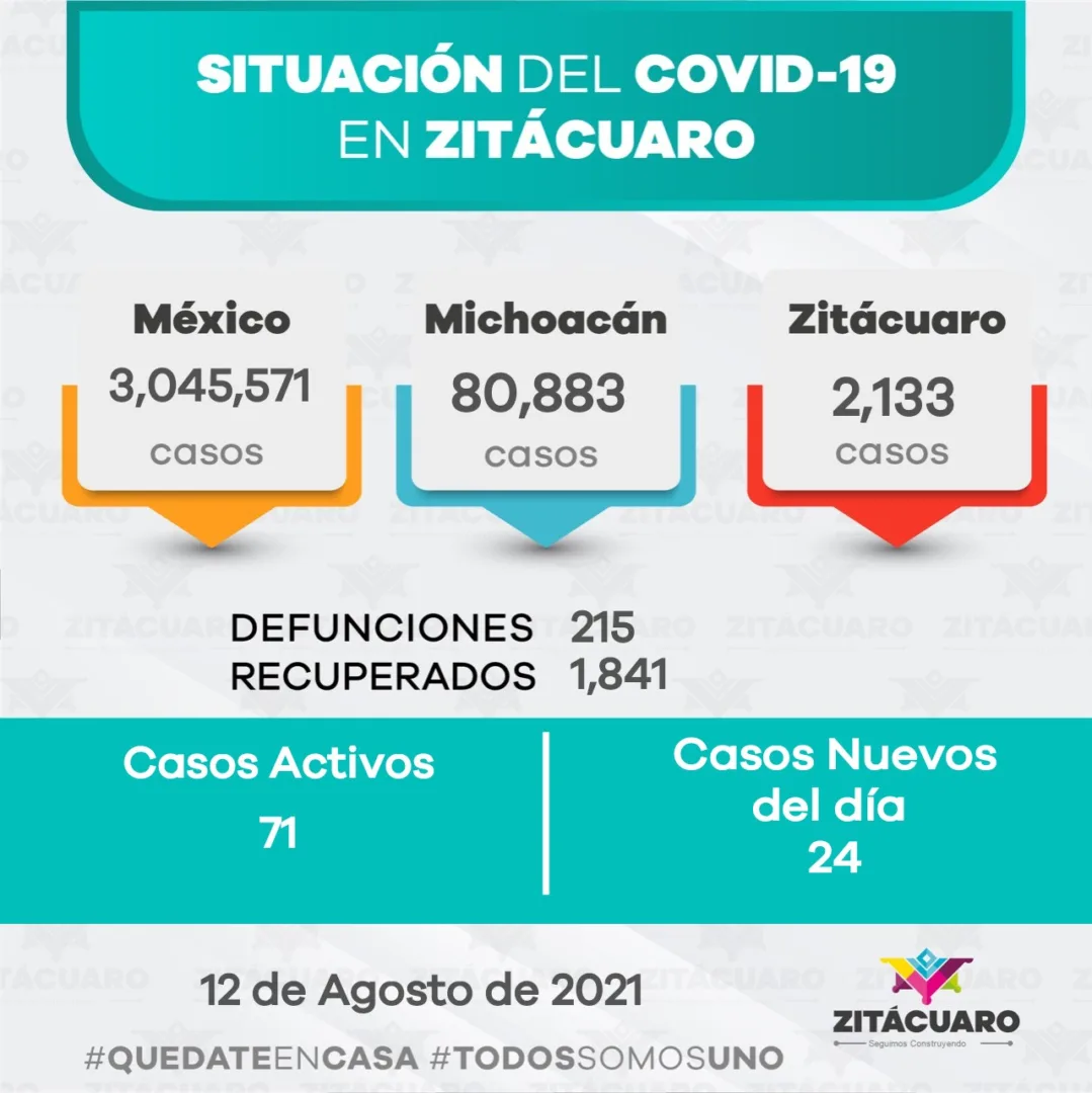 ⚠️ Alerta, Zitácuaro reportó hoy 24 casos positivos COVID-19, hay 71 casos activos y 16 casos sospechosos, hasta el momento se han registrado 215 defunciones relacionadas al coronavirus.