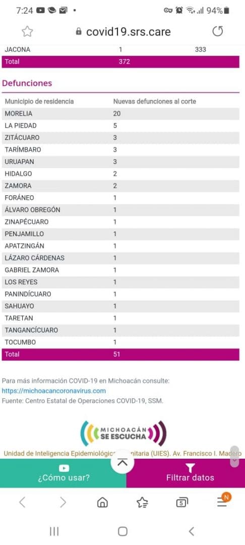 Zitácuaro reportó en las últimas 24 horas, 3 muertos y 8 casos positivos a COVID-19 y en Michoacán se registraron 51 defunciones y 372 casos nuevos por Coronavirus.