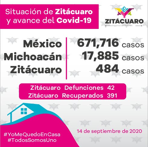 El Gobierno municipal de Zitácuaro que encabeza el alcalde Hugo Alberto Hernández Suárez, informa la situación de covid-19 en Zitácuaro, de acuerdo al reporte diario emitido por el Comité Estatal de Seguridad en Salud y a la información pública, que se encuentra disponible en https://michoacancoronavirus.com/nuevaconvivencia/ con corte al 14 de septiembre de 2020: